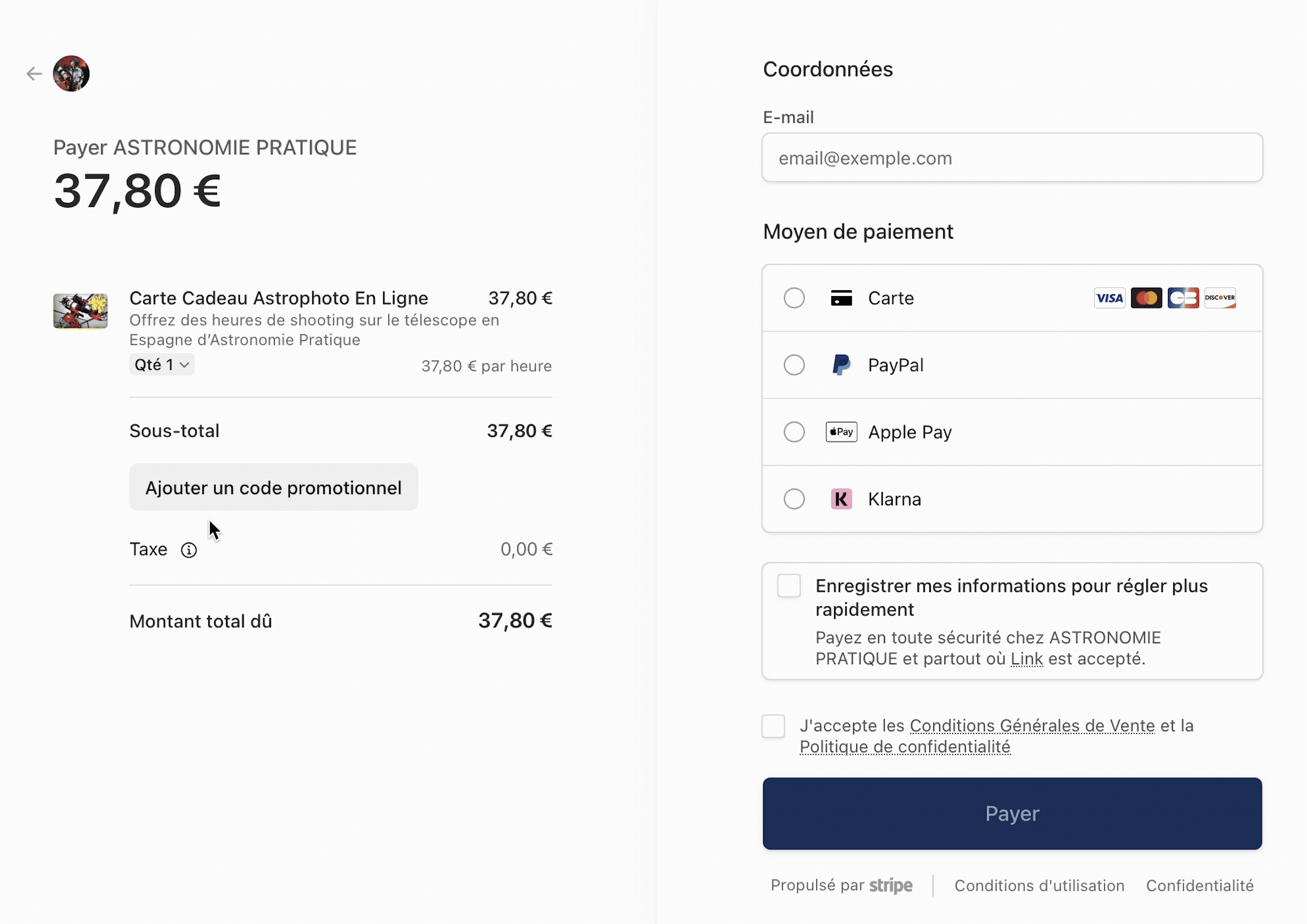 Les données de paiement sont échangées en mode crypté grâce au protocole défini par le prestataire de paiement (Stripe) agréé intervenant pour les transactions bancaires réalisées sur le site https://telescope.astronomie-pratique.com.