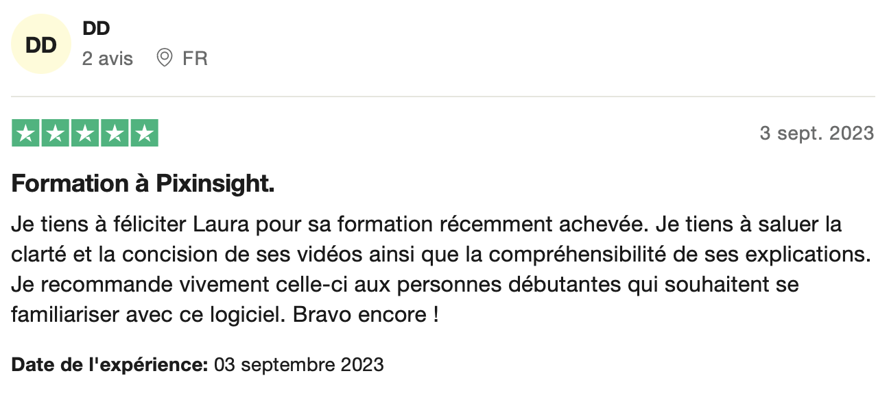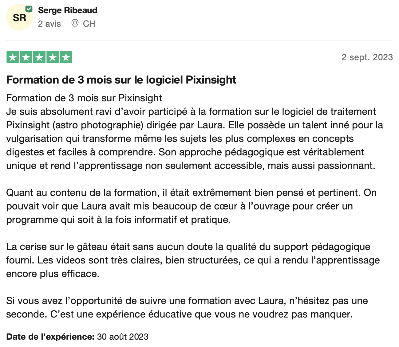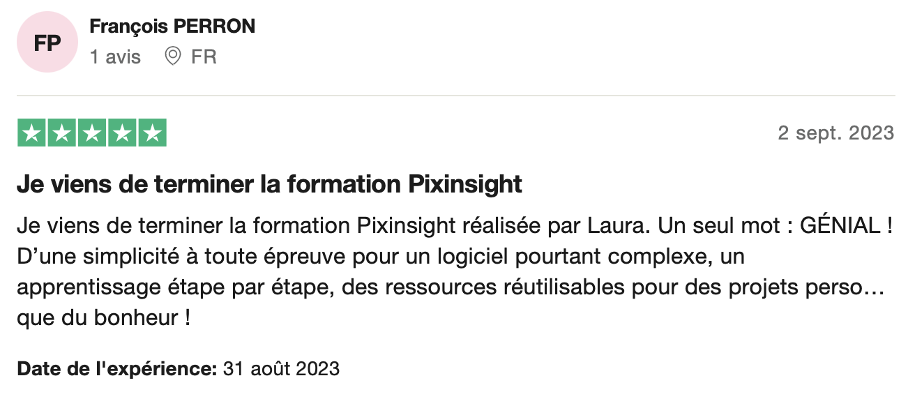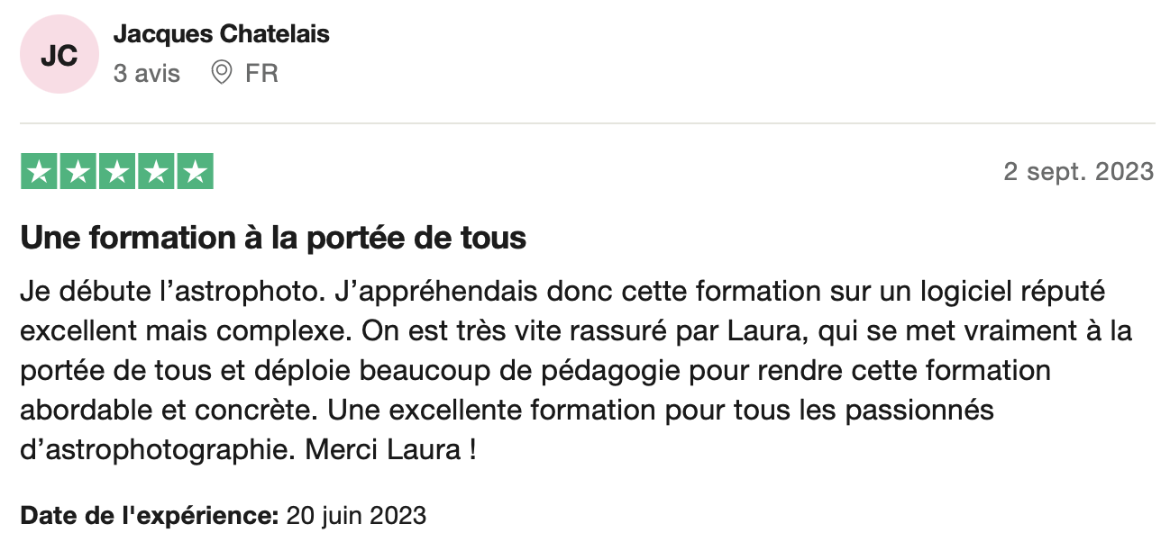 Par ailleurs, Photoshop n'est pas obligatoire, il existe également des alternatives gratuites et Laura vous montre dans la formation comment traiter de A à Z sous Pixinsight sans avoir besoin de passer par Photoshop.